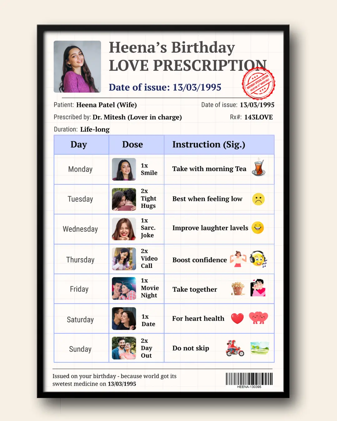 Instead of the doctor’s name, it says “Lover In Charge”-that’s you. The red stamp in the corner carries her birth date. Every daily dose is written in a sweet, funny way that she’ll smile at. And to balance the prescription look, I added more photos so the frame stays warm, romantic, and full of memories.